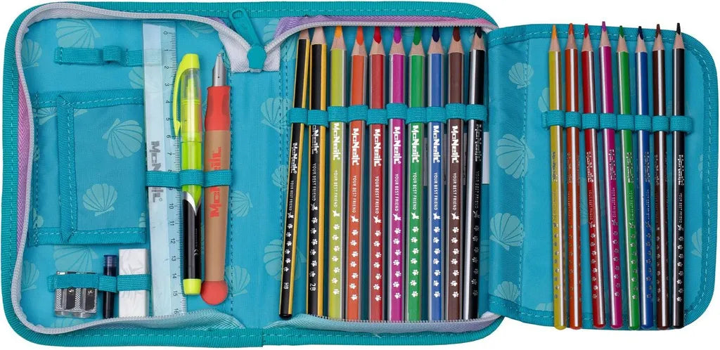 - Inoltre, nello scomparto principale 9 passanti in gomma per matite, gomma per cancellare, righello ecc. e 1 scomparto con chiusura a strappo