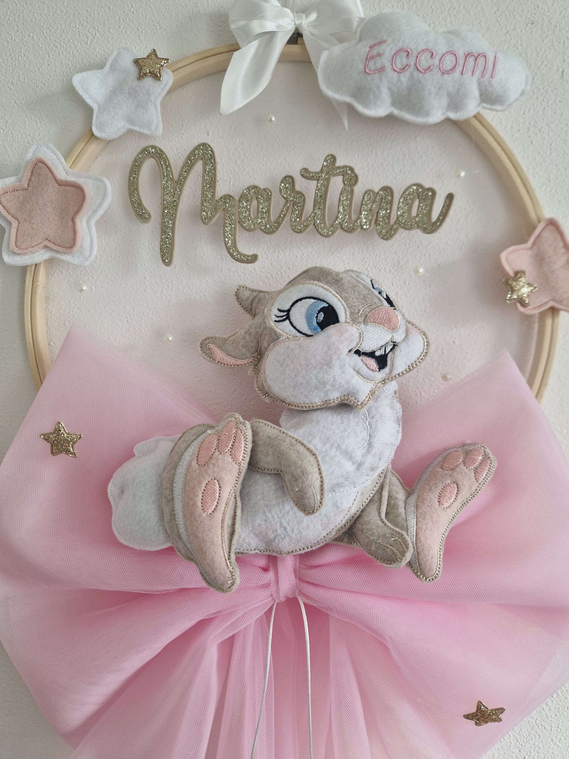 Sorprendi tutti con il nostro dolce fiocco nascita realizzato interamente a mano e decorato con una dolce coniglietta. Un regalo perfetto per esprimere la gioia e l'amore di una nuova vita!