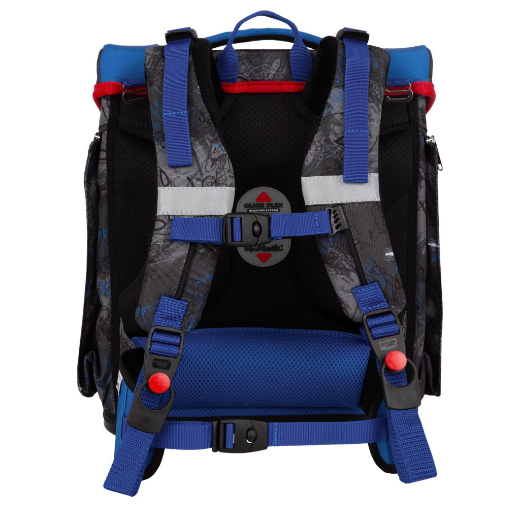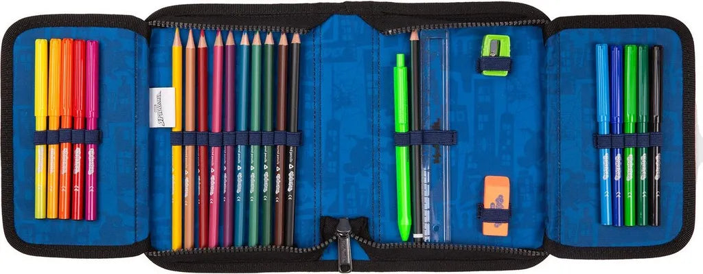 - Inoltre, nello scomparto principale 9 passanti in gomma per matite, gomma per cancellare, righello ecc. e 1 scomparto con chiusura a strappo